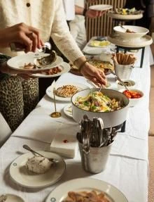 In the evening, whether at large tables or more intimate settings, we gather under the dim glow of chandeliers for a suspended moment.